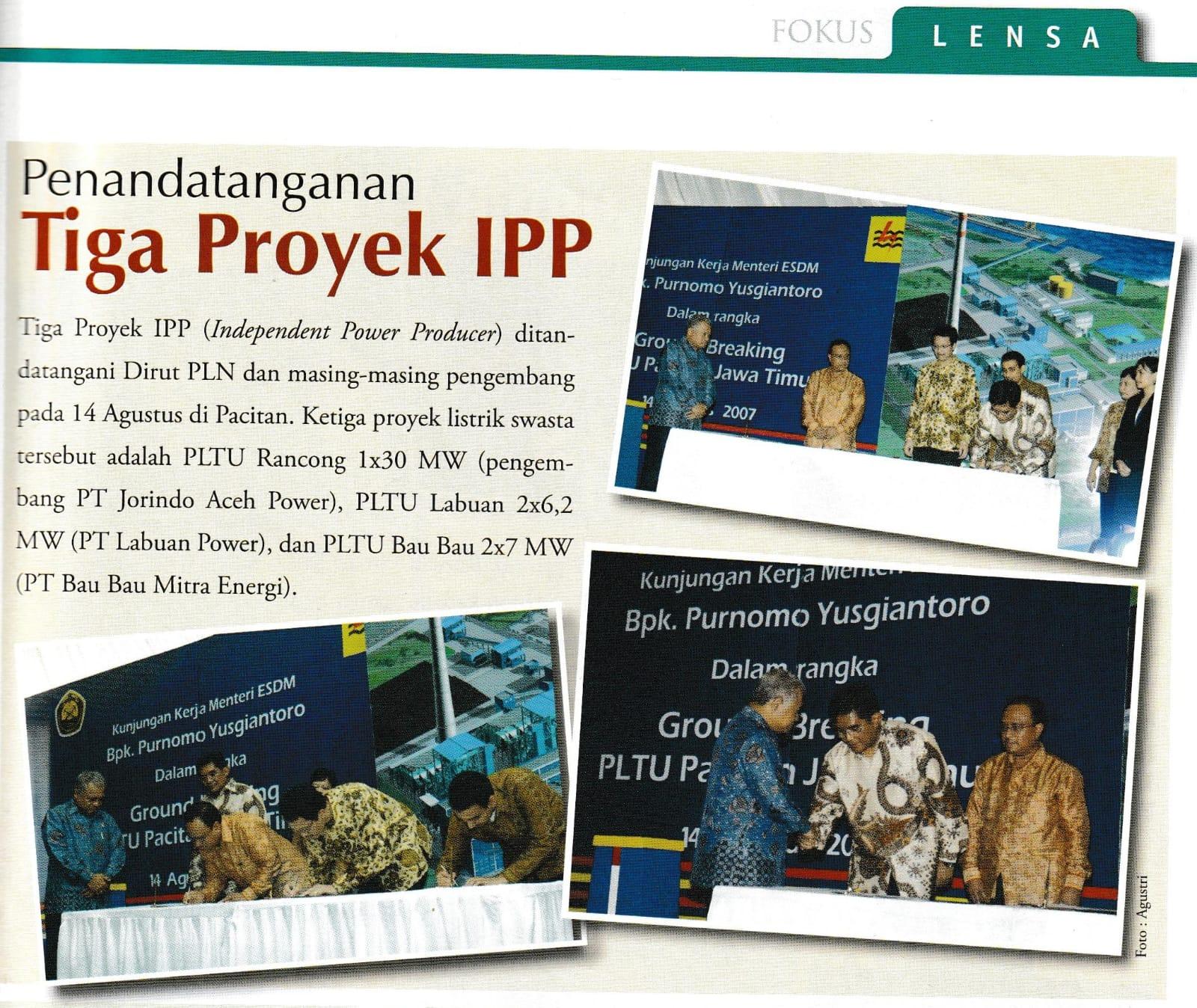 Bahkan pada 14 Agustus 2007, sudah di tanda tangani Power Purchase Agreement (PPA) dan dilakukan pada saat ground breaking PLTU Pacitan secara nasional di Pacitan Jawa Timur. “Sekalian Dengan 3 PLTU lainnya menandatangani PPA di depan Menteri ESDM dan Dirut PLN serta yang mewakili pemerintah. Sebagai proyek nasional IPP (Independent Power Producer). Tapi kemudian proyek itu tidak bisa diwujudkan,” kenangnya.