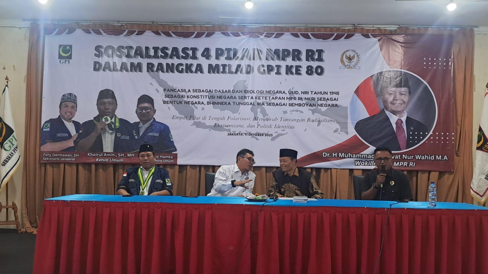 Jakarta – Dalam rangka memperingati Milad ke-80 Gerakan Pemuda Islam (GPI), digelar kegiatan Sosialisasi Empat Pilar MPR RI dengan tema “Pancasila sebagai Dasar dan Ideologi Negara, UUD NRI Tahun 1945 sebagai Konstitusi Negara, Ketetapan MPR RI, NKRI sebagai Bentuk Negara, dan Bhinneka Tunggal Ika sebagai Semboyan Negara” serta tagline “Empat Pilar di Tengah Polarisasi: Menjawab Tantangan Radikalisme, Ekstremisme, dan Politik Identitas”. Acara berlangsung khidmat di Gedung Juang Menteng, Jakarta, pada Sabtu, 11 Oktober 2025.