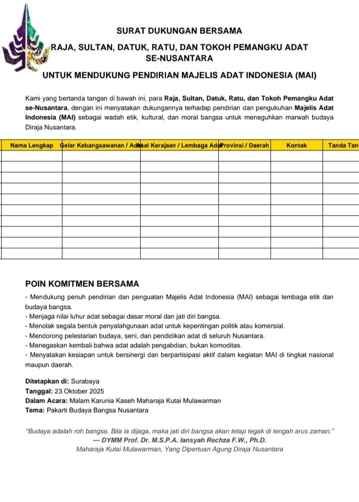 Dalam sidang tersebut, para Raja, Sultan, Ratu, Datuk, dan Tokoh Pemangku Adat se-Nusantara turut menandatangani Titah Diraja Nusantara, dengan Nomor Istimewa 0455.2210.2025 tentang Perkenan Pendirian Majelis Adat Indonesia (MAI).