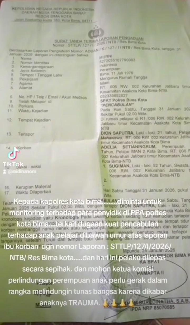 Perkara tersebut dilaporkan oleh ibu korban dengan nomor laporan STTLP/127/I/2026/NTB/Res Bima Kota, yang saat ini menjadi perhatian publik setelah beredarnya sebuah video pernyataan Raidin Anom di berbagai platform media sosial (medsos).
