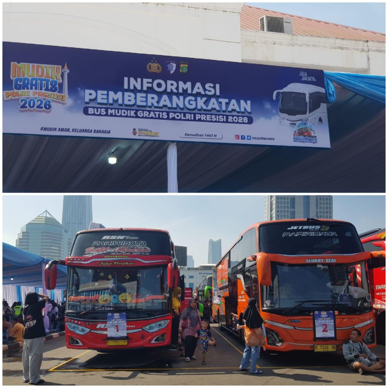 Polri memberangkatkan ribuan peserta Mudik Gratis di Lapangan Presisi Polda Metro Jaya dengan tujuan Jawa Tengah dan Daerah Istimewa Yogyakarta.