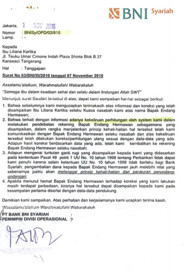 Kasus ini berakar dari surat resmi PT Bank BNI Syariah tertanggal 1 November 2016 (No. BNISyOPD/02/815), yang secara tertulis mengakui adanya: